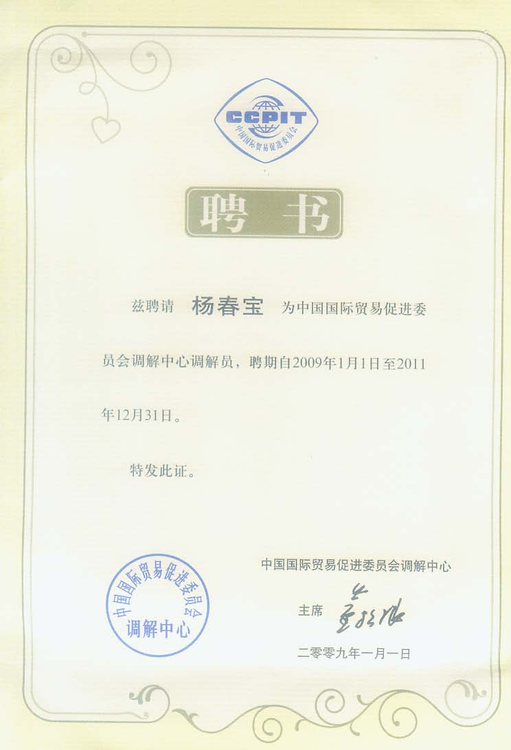 杨春宝高级律师近日再次被聘请为中国国际贸易促进委员会调解中心调解员 。