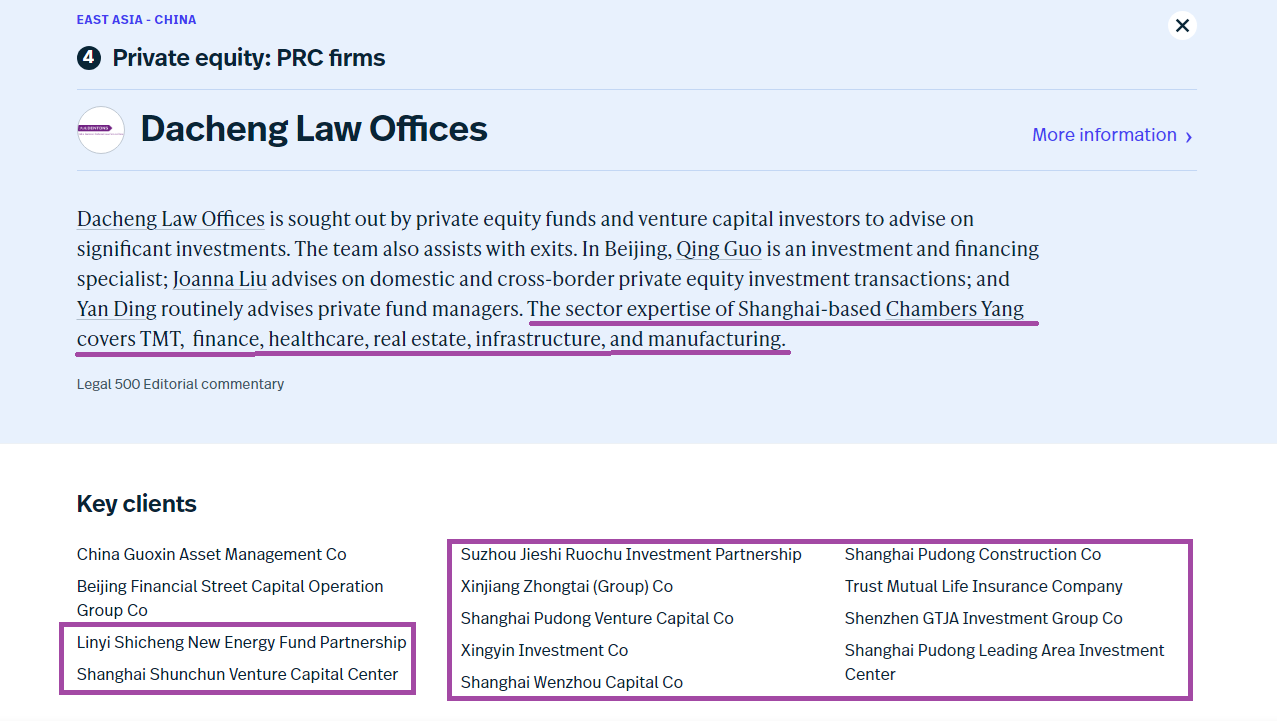 近日,国际权威法律评级机构The Legal 500(《法律500强》)发布了2025年度亚太区领先律师榜单,杨春宝一级律师入榜并在“私募股权基金”领域获特别推荐。大成律师事务所在私募基金领域被列举的13个Key Clients中有11个系杨春宝律师的客户。